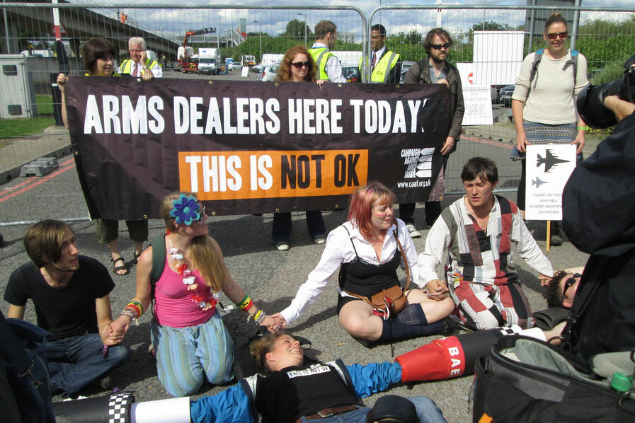 Photo: Activists blocking an entrance to the DSEI arms fair in 2013; Source: Stop the Arms Fair network, used with permission.